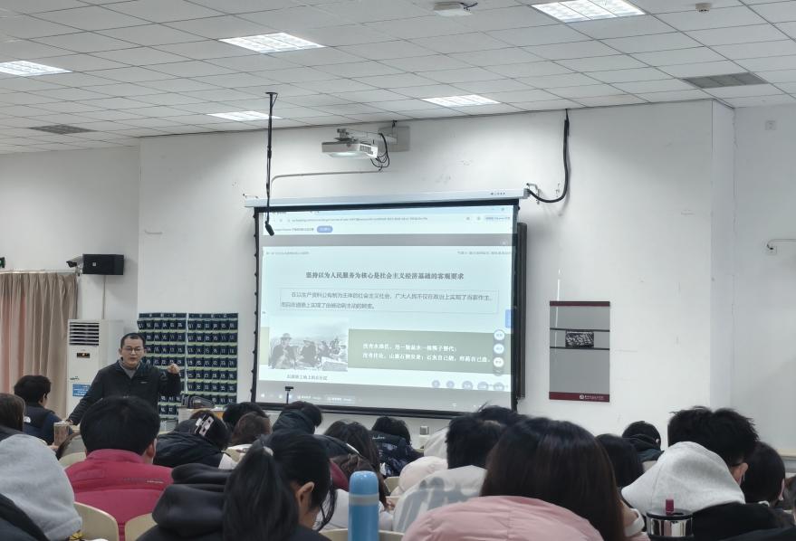 在此次活动中,马克思主义学院郭金银教师讲授《思想道德与法治》专题课程,以“坚持以为人民服务为核心”作为教学主线,一方面深入挖掘理论内涵,阐释红旗渠修建精神、“为人民服务是先进性与广泛性统一”等核心要点;另一方面紧密贴合学生关注焦点,围绕“社会主义市场经济背景下‘为人民服务’与‘为人民币服务’的价值辨析”“‘精致利己’与‘高尚奉献’的现实抉择”等青年面临的实际问题开展互动,并融入生活实例等鲜活资料,营造出生动且具思辨性的课堂氛围。